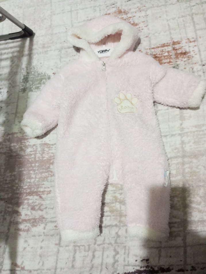 Yumuşak pembe renkli, kapüşonlu ve kürk detaylı kız bebek tulumu. Patili desen bulunur, soğuk havalar için uygundur.
