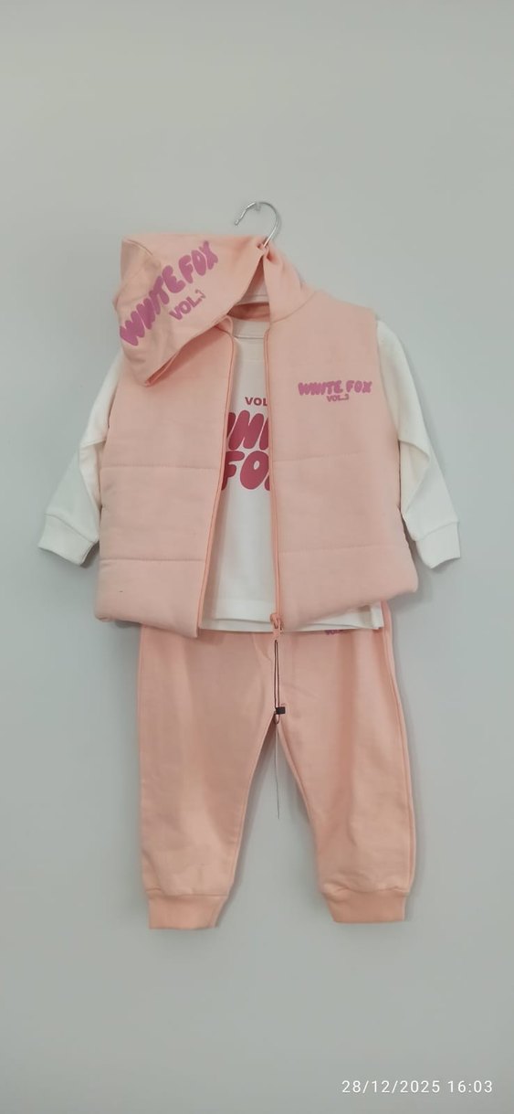 elyaflı penye astarli kapüşonlu yelek, baskılı yazılı tişört, ile uyumlu pantolon içeren kız bebek üçlü takımı