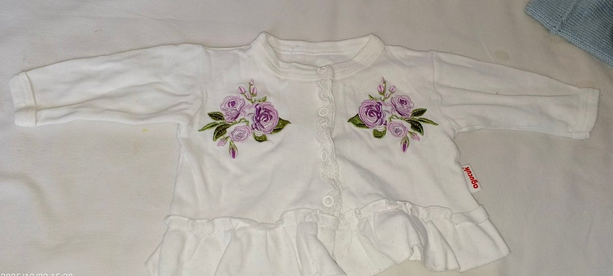 Beyaz bebek kız hastane kıyafeti, pastel renklerde nakışlı çiçek detayları ve düğmeli ön kapama ile. Yumuşak ve rahat kumaş.