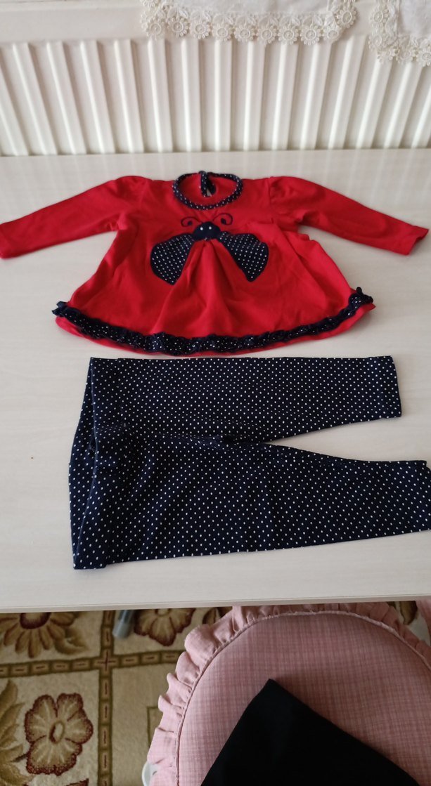 Uzun kollu kırmızı üst, puantiyeli fırfır detayları ve puantiyeli tayt ile tamamlanmıştır.
