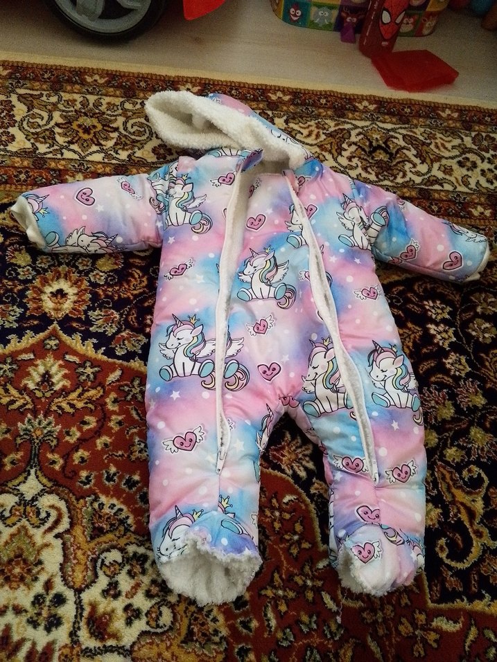 Renkli unicorn desenli pastel bağlama desenli kız bebek tulumu, kapüşonlu ve kürklü detaylıdır, sıcak tutar.