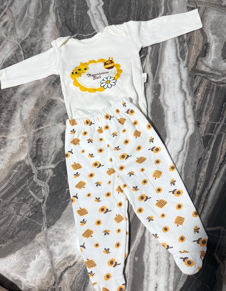 Bebek kız için renkli baskılı, uzun kollu ve yuvarlak yakalı takım. Yumuşak kürk dokulu kumaştan, dantel detaylı, ayaklı pantolonları ayçiçeği ve arı desenlidir.