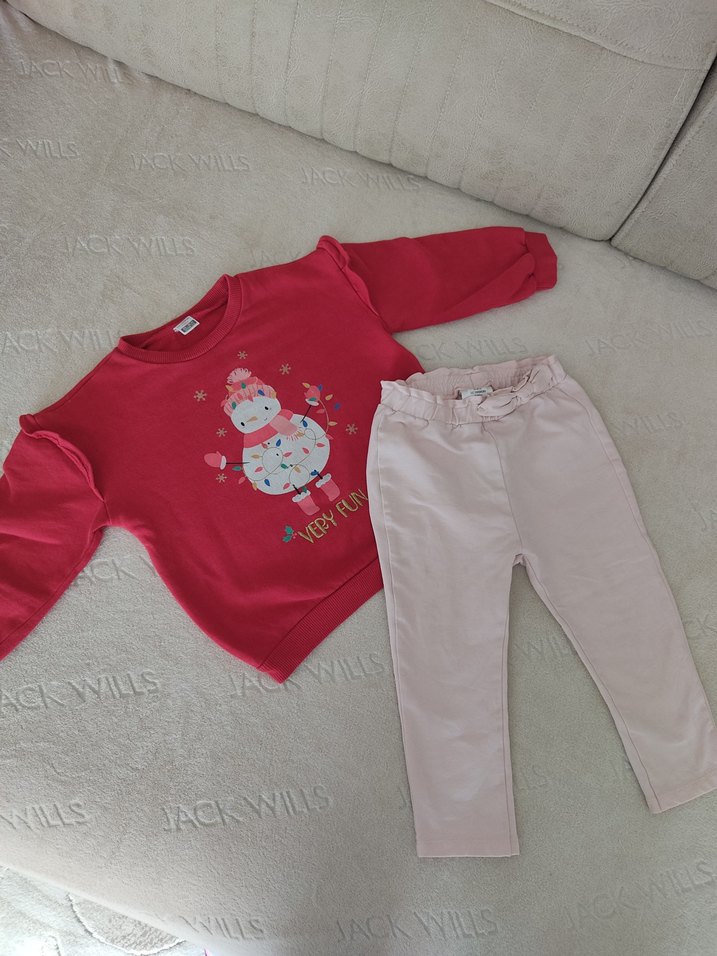 Uzun kollu, renkli desenli kız bebek takımı, yumuşak kumaş pantolon ile birlikte.Önundeki baskıda çatlamalar var,leke falan yoktur.