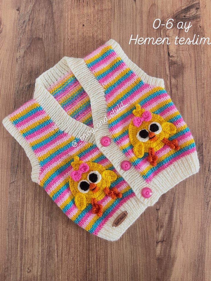 0-6 ay kız bebekler için nakışlı desenli, renkli örgü yelek. Düğmeli, kolsuz ve bol kesim bohem tarzda.