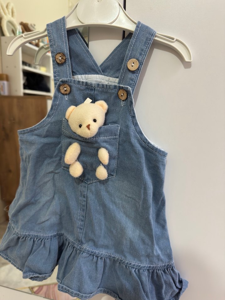 Düğmeli askılı, nakışlı ayıcık detaylı, bol kesim mavi kot kız tulumu. Pastel sokak stilinde, volanlı etek ucu ile. Ayıcık detaylı 9 ay etiketli Hiç kullanılmadı.