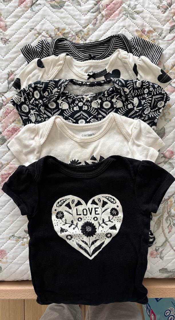 Siyah renkli kız bebek body, kısa kollu, yuvarlak yakalıdır. 'LOVE' yazılı kalp desenli ve dantel detaylıdır. Çok küçük lekeler var belli belirsiz fotoğraflarda belirttim