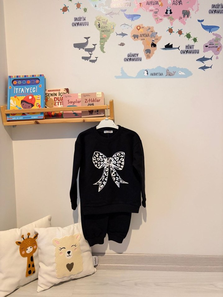 Uzun kollu siyah üst ve pantolondan oluşan kız bebek takımı, üzerinde baskılı fiyonk deseni bulunur. Yumuşak kumaştan üretilmiştir.