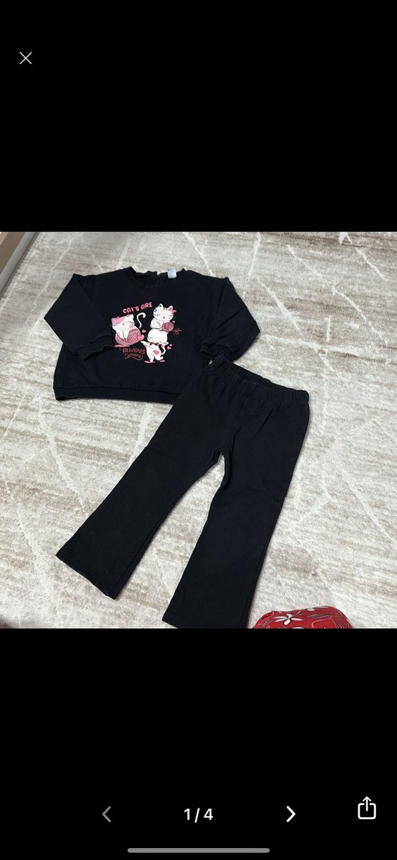 Uzun kollu, baskılı kedilerle süslenmiş ve örme kumaştan yapılmış siyah kız bebek takımı, uyumlu pantolonla tamamlanmıştır.