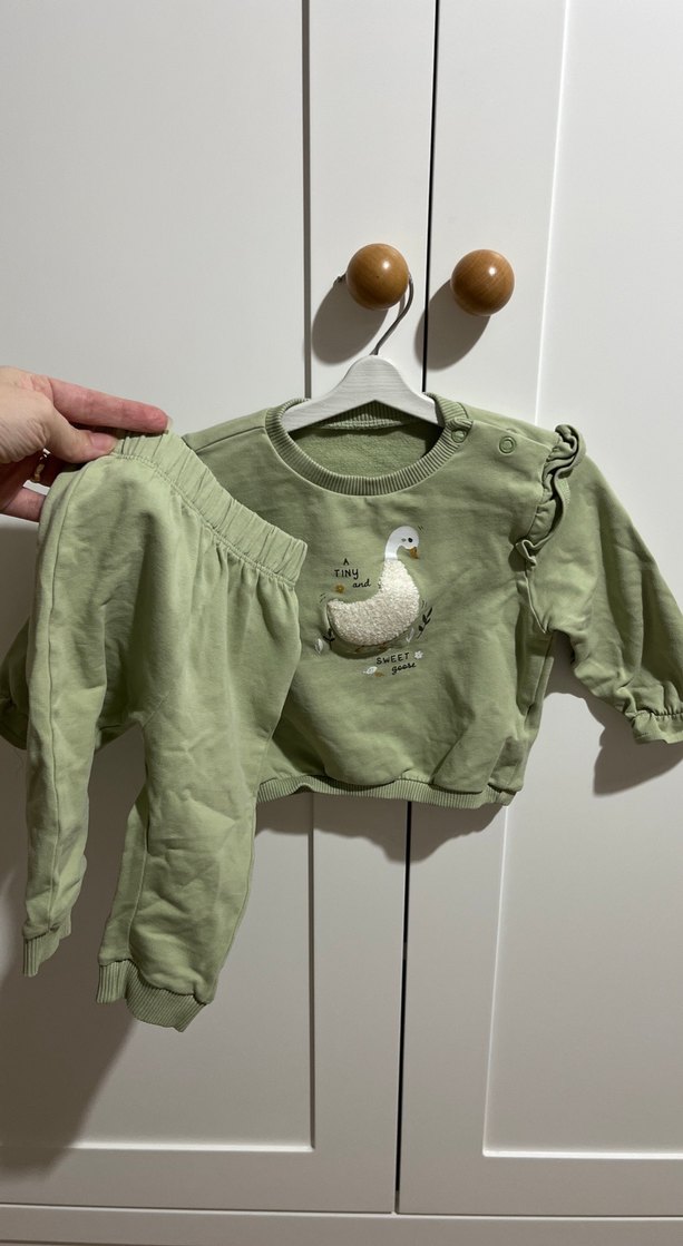 Pastel yeşil renkli, uzun kollu ve nakışlı detaylara sahip bebek kız takımı. Omuzda düğmeli, yumuşak kumaşlı rahat tasarım.