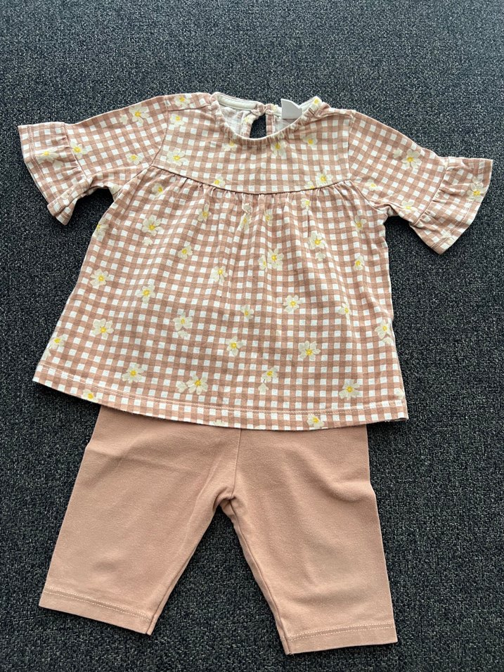 Pastel bej renkli, kısa kollu ve fırfırlı detaylı kız bebek takımı. Üstü kareli desenli, altı düz şortlu. 6-9 ay sorunsuz