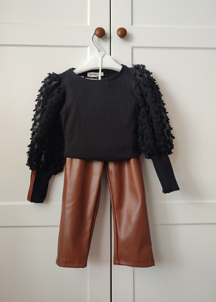 Kolları tül detaylı bluz ve kahverengi kemer detaylı pantolon
