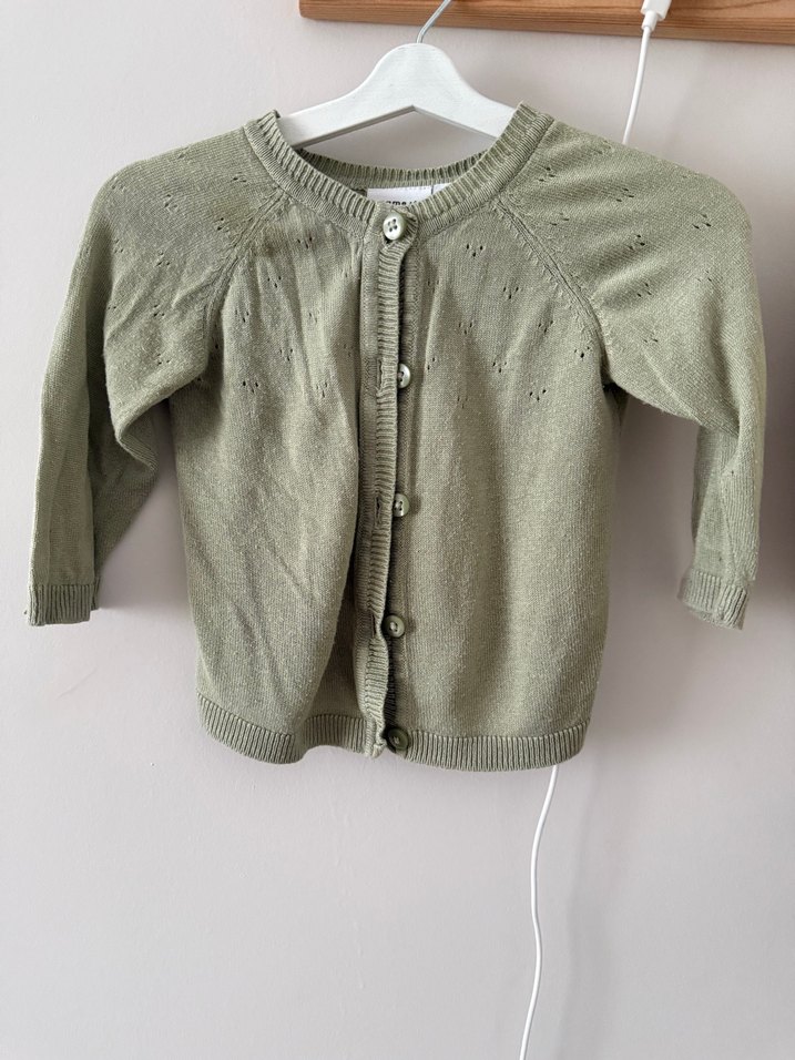 Düğmeli, uzun kollu, bol kesim kız hırkası. Yeşil renkli, yumuşak triko