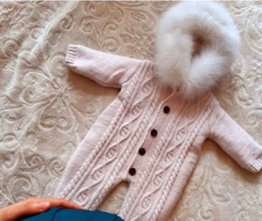 Pastel pembe renkte, nakış detaylı ve kürklü yakalı bebek tulumu, sıcaklık ve şıklık sunar. ❄️ 3-6 ay