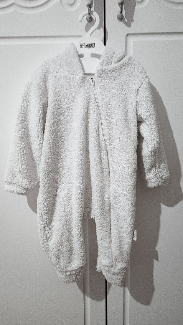 Bebek kız tulumu, beyaz renkli ve kürklü detaylı yumuşak kumaştan, kesimli yaka ile sıcak tutar. ❄️