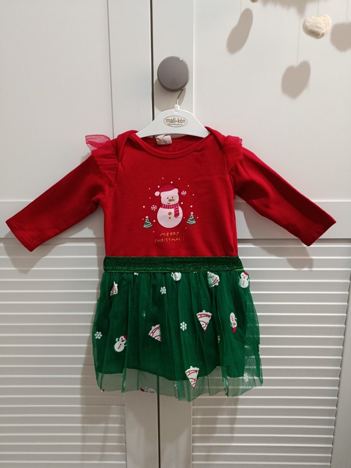 Uzun kollu, içi polarlı, omuzları tüllü, kardan adam desenli, kırmızı zıbın. Renkli nakışlı, fırfırlı detaylı ve yeşil tül etekli, yumuşak ve sıcak kumaştan yapılmıştır.