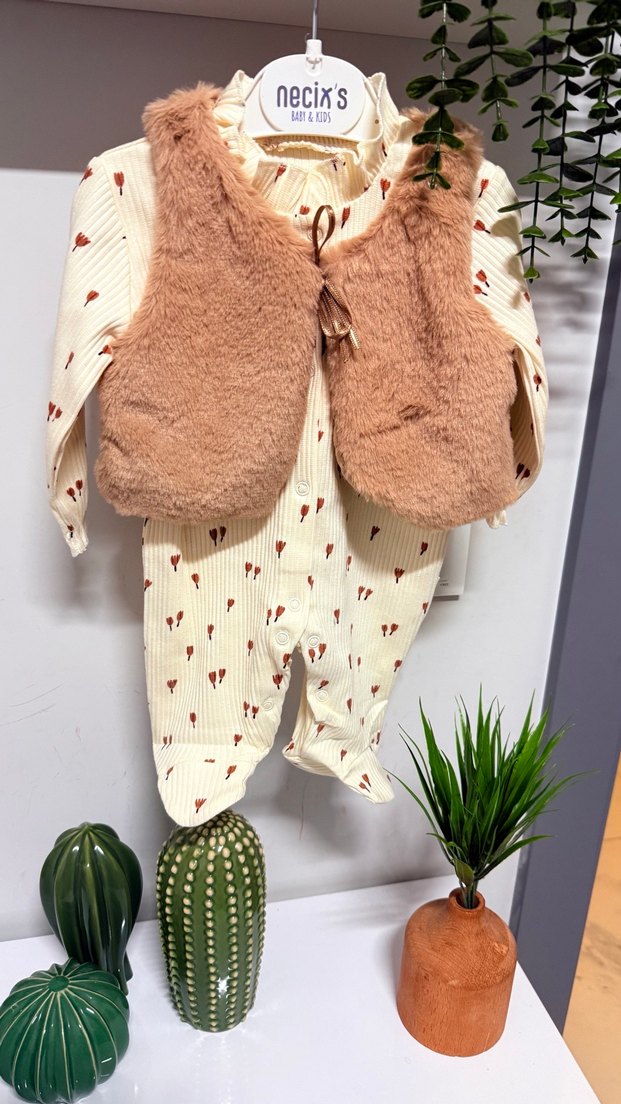 0-3 ay Kahverengi tüylü yelek ve pastel tonlarda desenli, kesimli yakalı kız bebek tulumu.