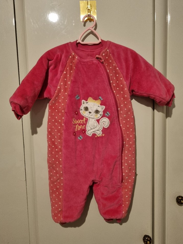 Pembe renkli, yuvarlak yakalı kız bebek tulumu, nakışlı desen ve örme dokusuyla dikkat çeker. Renkli detaylara sahip, sıcak tutan tasarım. ❄️