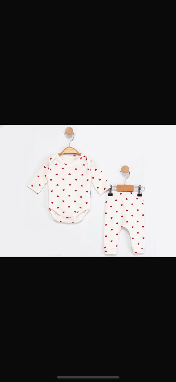 Uzun kollu, düğmeli ve kırmızı kalp desenli beyaz kız bebek takım seti.