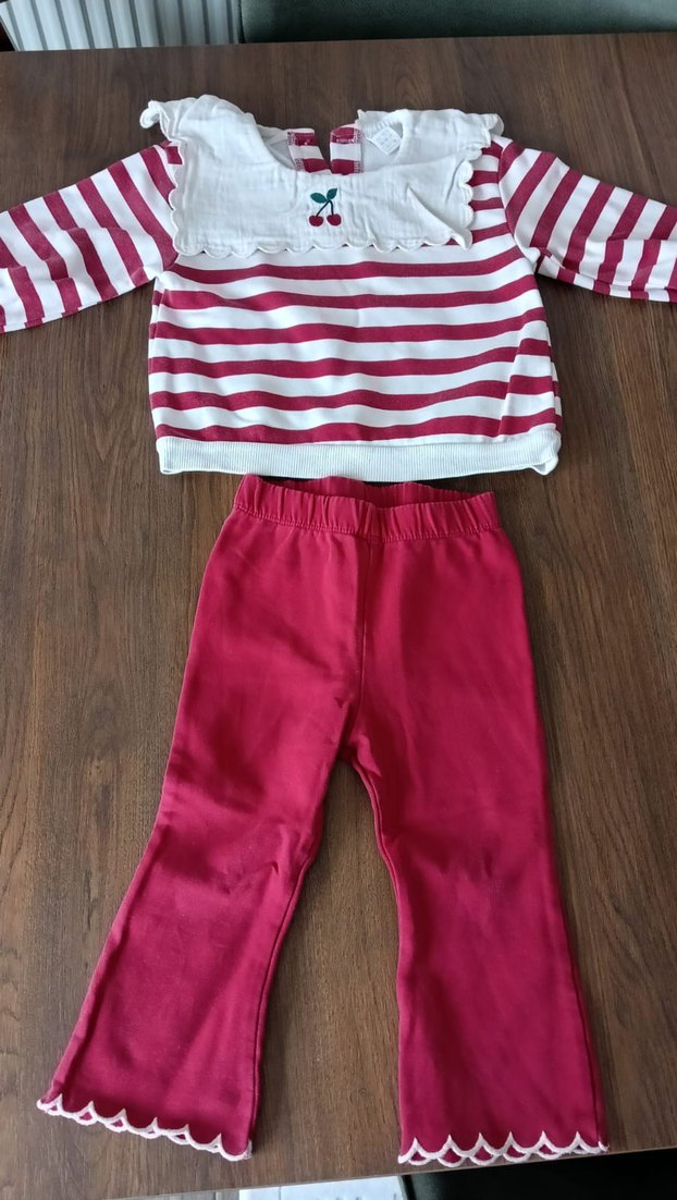 Kırmızı beyaz çizgili, kiraz detaylı yakalı uzun kollu üst ile kırmızı pantolondan oluşan kız bebek takımı.