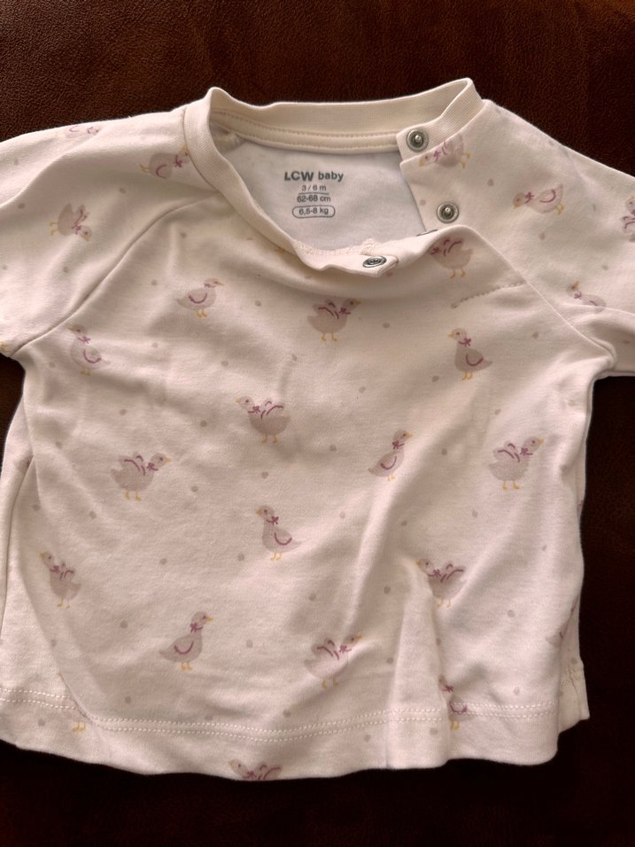 Kız bebek için düğmeli, uzun kollu, yuvarlak yaka ve bol kesim beyaz tişört. Yumuşak pamuktan, pastel kuş desenli. LCW baby etiketi var.