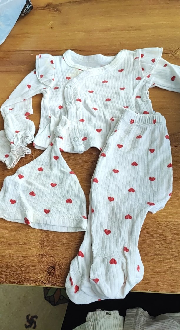 Uzun kollu, fırfırlı üst, pantolon ve şapkadan oluşan, küçük kırmızı kalp desenli açık beyaz bebek kıyafet takımı.
