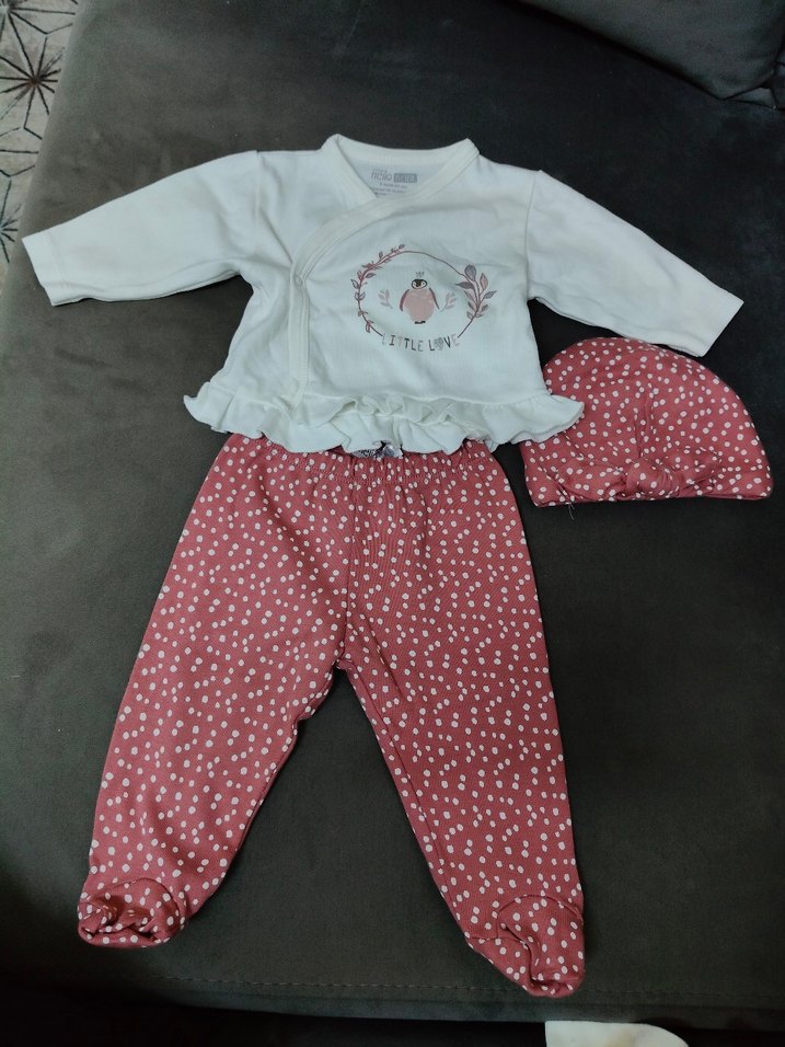 Uzun kollu beyaz üstte renkli baskı ve fırfır detayı, desenli pembe pantolon ve uyumlu şapka bulunur.