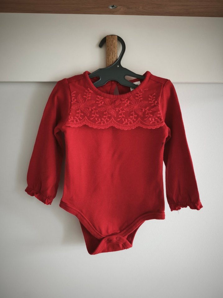 Uzun kollu kırmızı bebek body, göğüste dantel detaylı ve yuvarlak yaka. Yumuşak kumaş ve zarif dantel hoş bir görünüm sağlar.