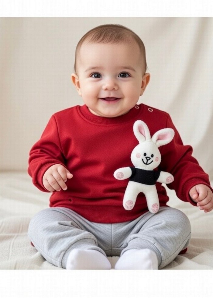 Renkli, örgü uzun kollu kırmızı üst ve baskılı tavşan desenli, açık gri pantolonlu kız bebek takımı.