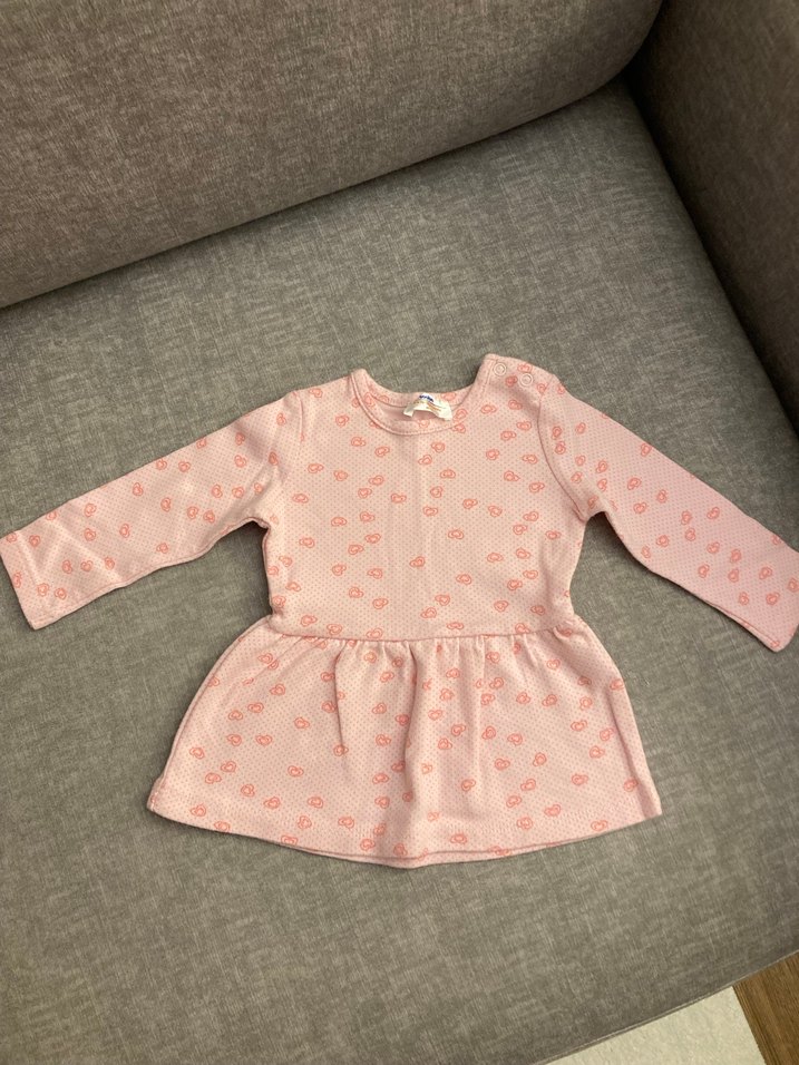 Kız çocuklar için uzun kollu, bol kesim, düğmeli, bisiklet yaka, pastel pembe baskılı elbise. Yumuşak ve sıcak kumaştan üretilmiştir.