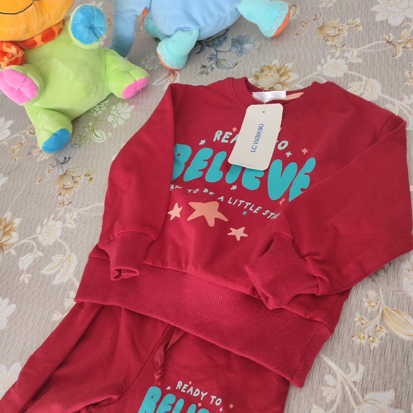 Kız bebek için uzun kollu, renkli desenli ve yumuşak örgü kumaştan yapılmış kırmızı takım. Üzerinde "Ready to Believe" yazısı bulunur. ⭐