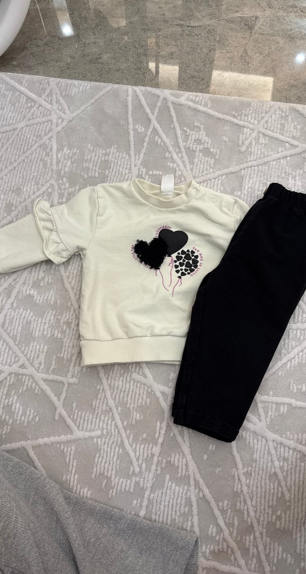 Baskılı kalp desenli beyaz triko uzun kollu üst ve koyu renkli pantolondan oluşan bebek kız takımı. Kollarında ince fırfır detayları bulunur.