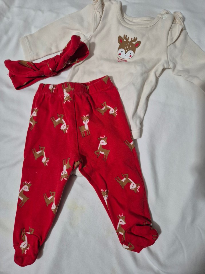 Uzun kollu triko üstünde geyik baskısı bulunan, renkli geyik desenli kırmızı pantolon ve uyumlu kırmızı saç bandından oluşan kız bebek takımı.