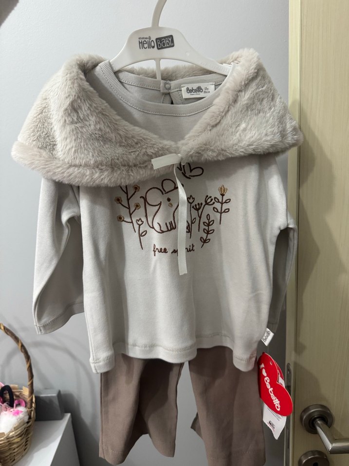 Baskılı uzun kollu bej üst ve tüylü detaylı yakalı, gri pantolonlu kız bebek takımı.