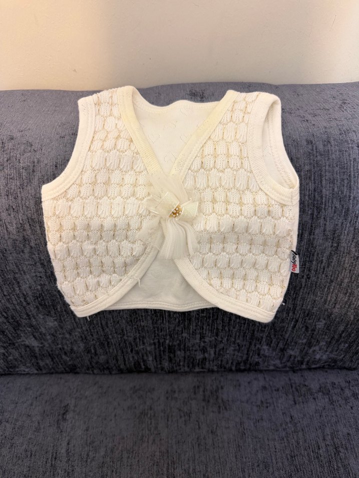 Ben 1 qydqn 1 yaşa kadar kullandım bolero gibi. Beyaz renkli, triko dokuma yumuşak kumaştan yapılmış, kolsuz kız çocuk yeleği. Önde süslü fiyonk detayı bulunur.