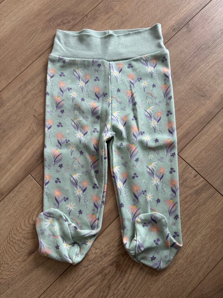 Kız çocuklar için elastik bel bantlı, yumuşak ve sıcak kumaştan, yeşil tonlu pastel çiçek desenli, bol kesim ve patikli pantolon.