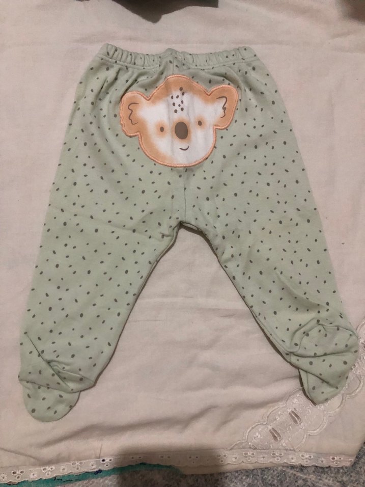 Yeşil renkli, leopar desenli ve önünde sevimli koala figürü bulunan kız bebek pantolonu. Fiyonk detaylarıyla süslenmiştir.