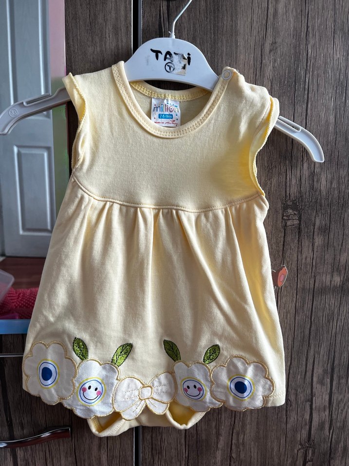 Sarı renkli, pamuklu, kolsuz kız bebek elbisesi, nakışlı fırfır detaylara sahiptir. Hediye geldiği için etiketi yok ancak hiç giyilmedi peki ürünü