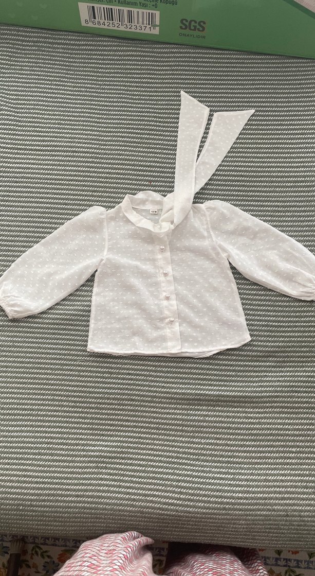bol kesim, uzun kollu, yakalı ve düğmeli beyaz kız gömleği, ince nakış detaylı. 12 aylık için