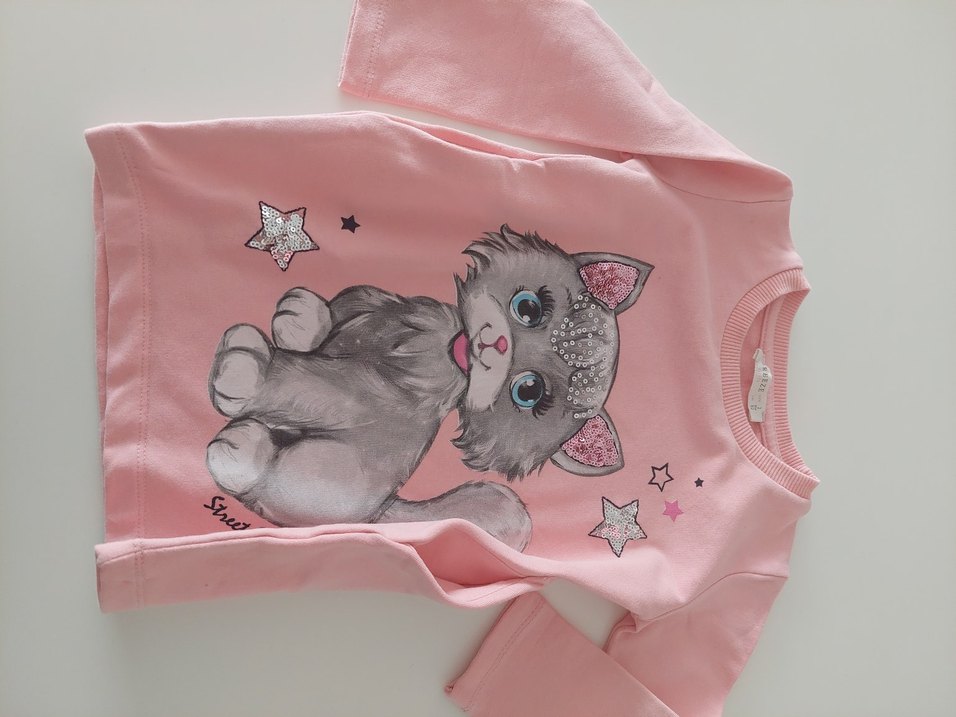 Pastel pembe, uzun kollu ve bisiklet yaka kız çocuk sweatshirtü, sevimli kedi baskılı arkasından da baskılı cepli elbise olarakta kullanılır.