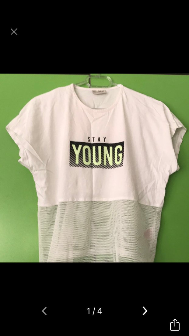 Kızlar için beyaz tişört, kısa kollu ve yuvarlak yaka. "STAY YOUNG" baskılı, bol kesim ve alt kısmı dantelli, sentetik kumaştan yapılmıştır.