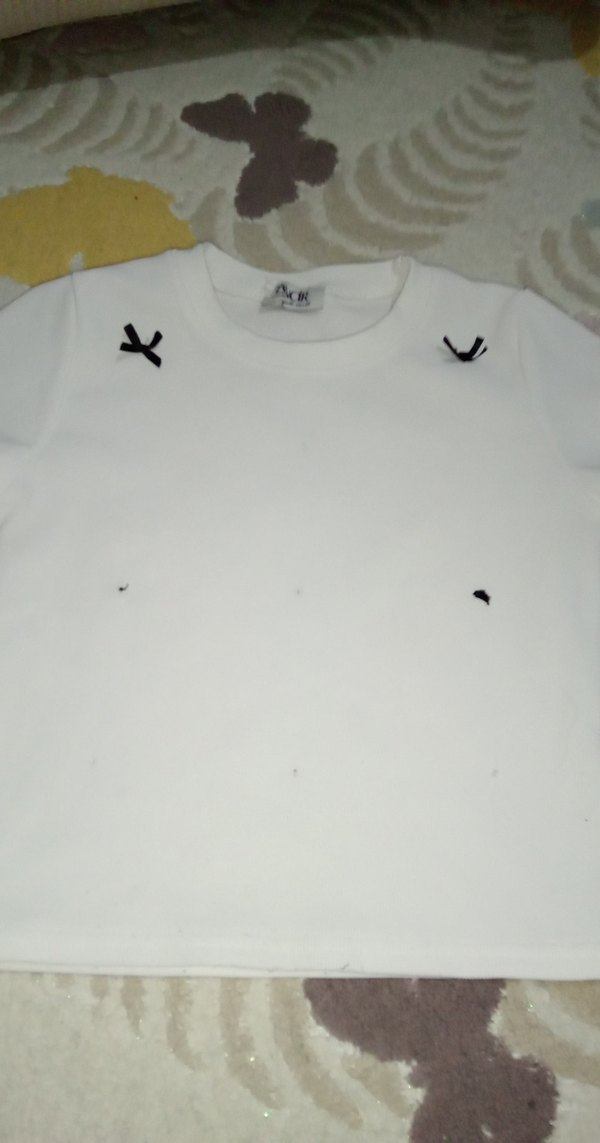 beyaz kısa kollu, yuvarlak yaka tişört. Sentetik kumaştan, bol kesim ve omuzlarda küçük siyah baskılı detaylarla sade tasarım.