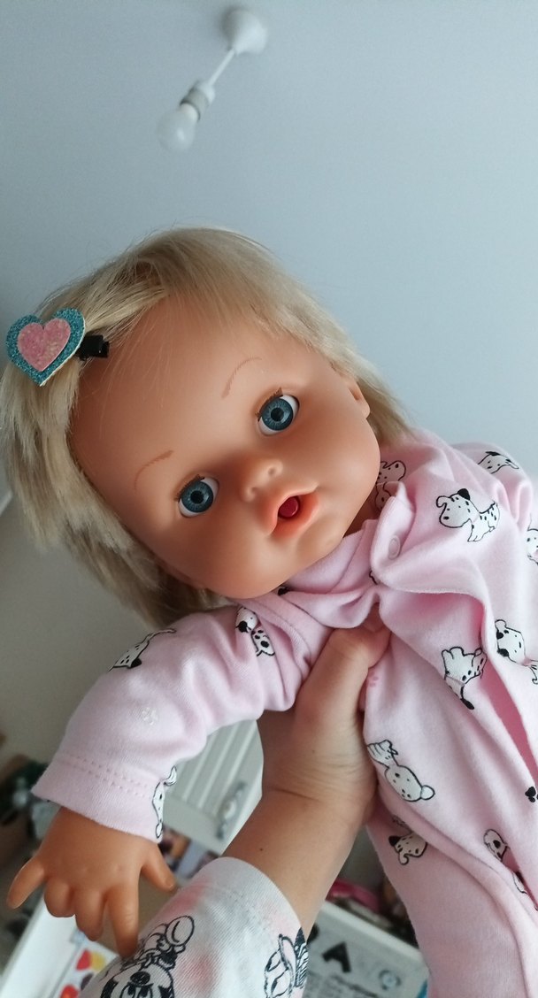 Baskılı tulum giymiş pembe oyuncak bebek, emzik ve kalp şeklinde saç tokasıyla. Yumuşak ve sarılmaya uygun.