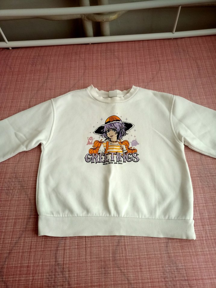 Beyaz, yuvarlak yaka, uzun kollu, bol kesim sweatshirt. Baskılı ve örgü detaylı, yumuşak ve sıcak kumaştan üretilmiştir. Günlük kullanıma uygundur. kız çocuğu için çok az belki 2 sefer anca giydi kızımın