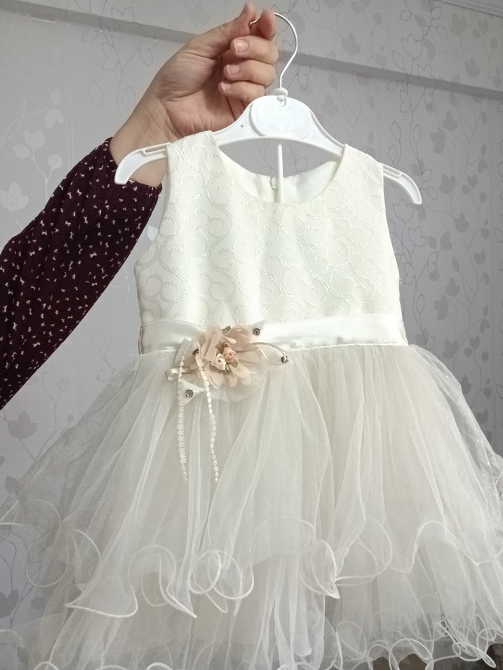 İşlemeli detaylara sahip, kolsuz beyaz kız çocuk elbisesi. Modern klasik tarzda, beli çiçek süslemeli ve fırfırlı etekli.bir kere giyildi