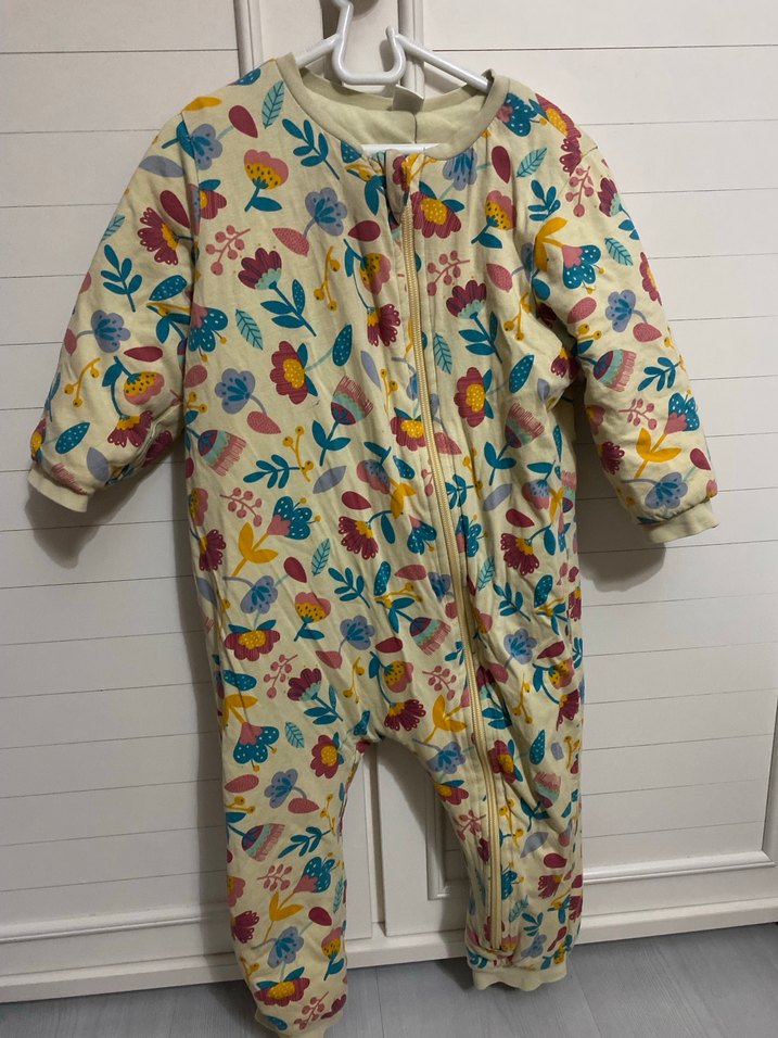 Pastel çok renkli polar tulum, uzun kollu, yuvarlak yakalı ve kolay kullanım için fermuarlıdır. Çiçek desenleri ile süslenmiştir.