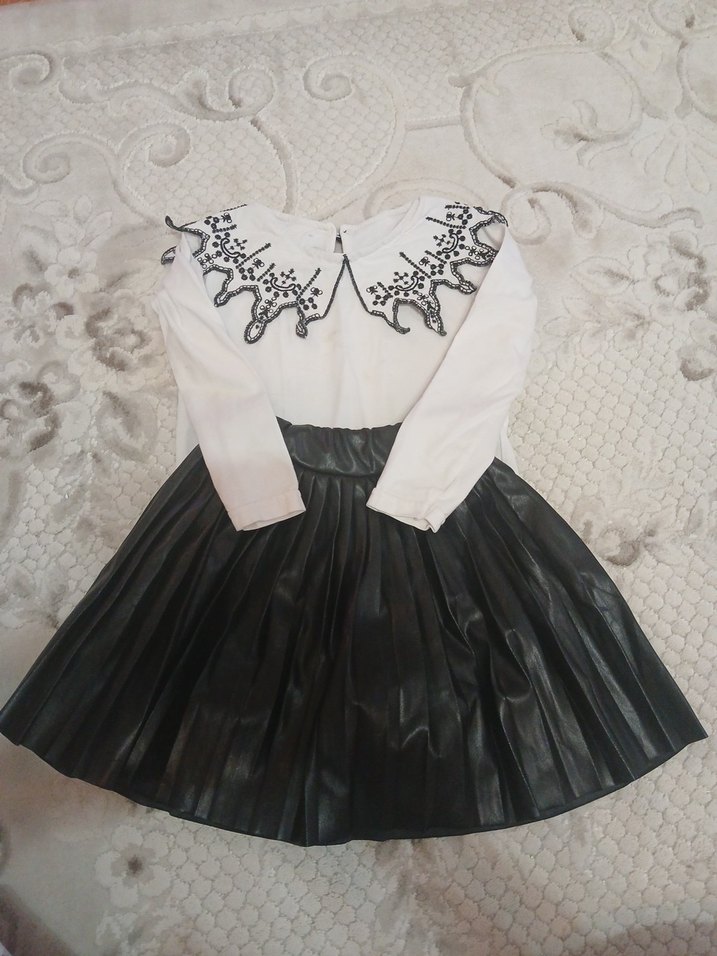 Deri pileli eteği ve nakışlı bluz.. toplasan 5 kere giyinilmemistir.Alacak kişiye hayırlı olsun.3-4 yaş
