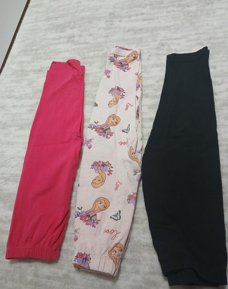Üçlü kız çocuk tayt seti, rahat kesim ve lastikli bel ile. Bir tanesi düz pembe, biri karakter ve kelebek baskılı, diğeri siyah. Yumuşak ve sıcak kumaştan üretilmiştir.