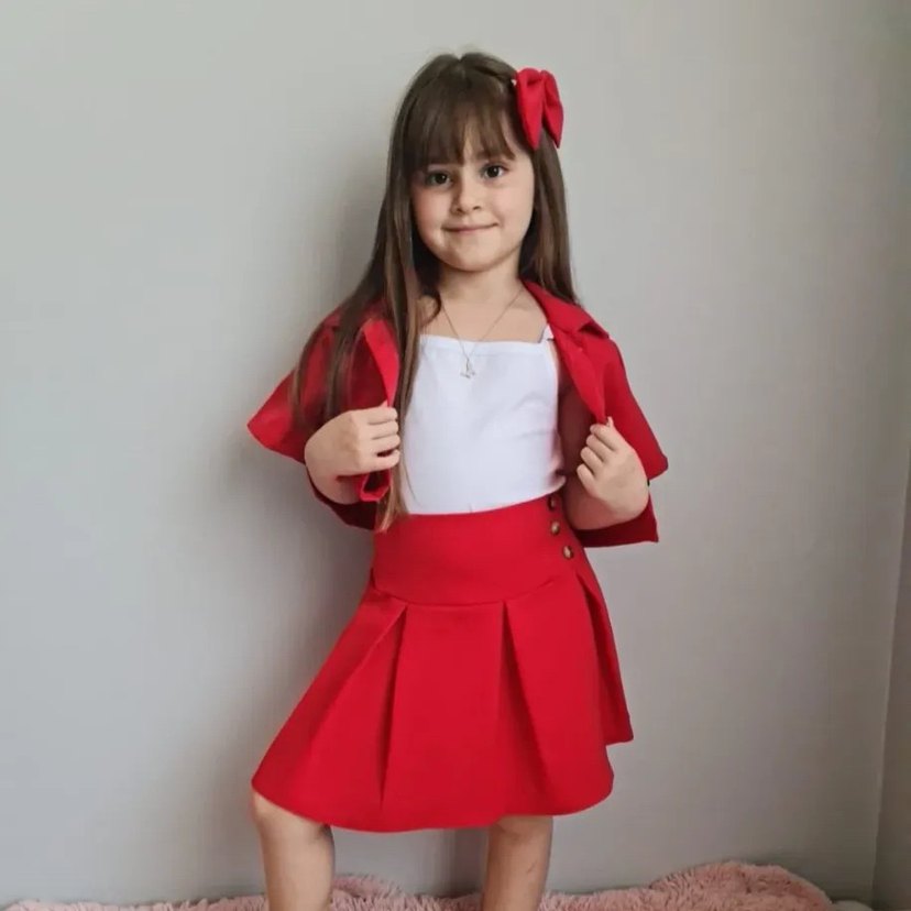 Kız çocukları için kırmızı, düğmeli ve yaka detaylı ceket. Uzun kollu, yumuşak ve sıcak kumaştan, rahat kalıplı ve desensiz. Askılı bluz, Ceket ve etek dabıl kumaş. Fiyonklu toka hediyeli. 4-5-6-7-8-10-11-12-13-14