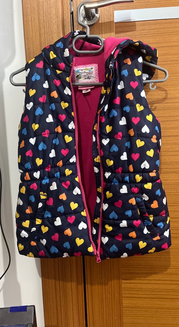 Kız çocukları için renkli kalp desenli, fermuarlı ve fitted kesim yelek, rahat sokak stili için uygundur.kalındır .içi polarlı. Çok memnun kalırsınız.yıpranmış değildir .