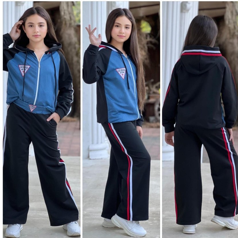 Kız çocukları için 6ve 15 yaş arasında fermuarlı, mavi ve siyah renklerde, etnik desen detaylı eşofman takımı. Uzun kollu, regular fit ve straplez yaka tasarımıyla günlük kullanım için uygundur.